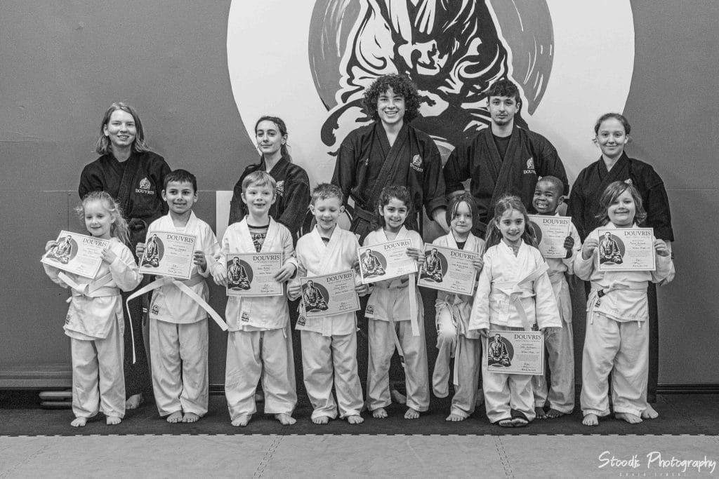 Comparison to self: In karate, the individual progresses at his or her own pace. Everyone aims for the same goals (belts), but entirely on one’s own schedule and according to one’s capability. In that way, karate is an exceptionally inclusive sport, and it’s the reason DOUVRIS members range from 4 years old to 84. At DOUVRIS, no one is left behind because everyone is treated as an individual, right down to being able to start their program at any time rather than with a cohort. There is no pressure to advance with a particular group of people (a sure recipe for some being left behind and others becoming bored).